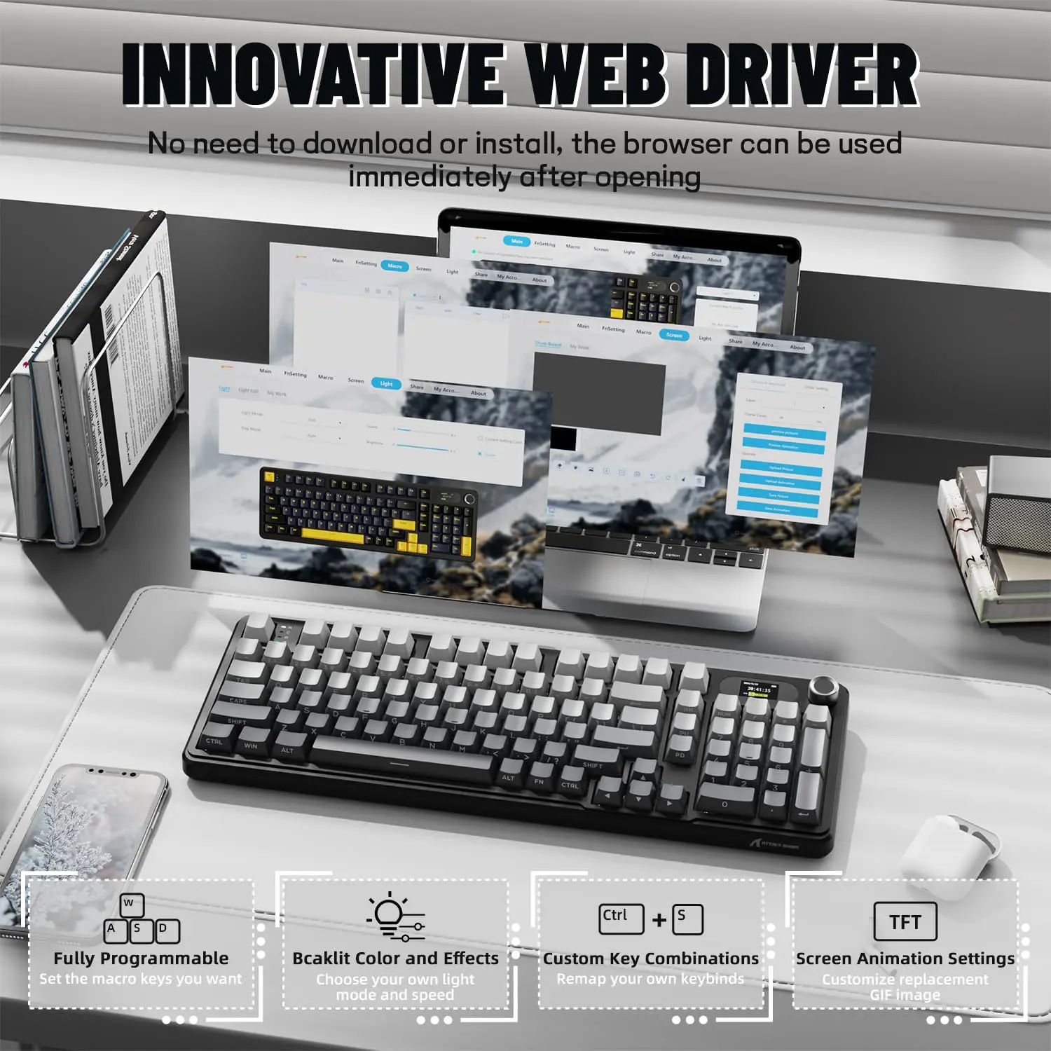 The keyboard features hot-swappable support for 3/5-pin switches, allowing you to tailor your typing feel instantly. Its built-in smart display and multi-function knob give you intuitive control over system info, volume, lighting, and more. Customize your setup further with vibrant RGB lighting via the web driver and enjoy a refined look with the Gradient Black aesthetic.