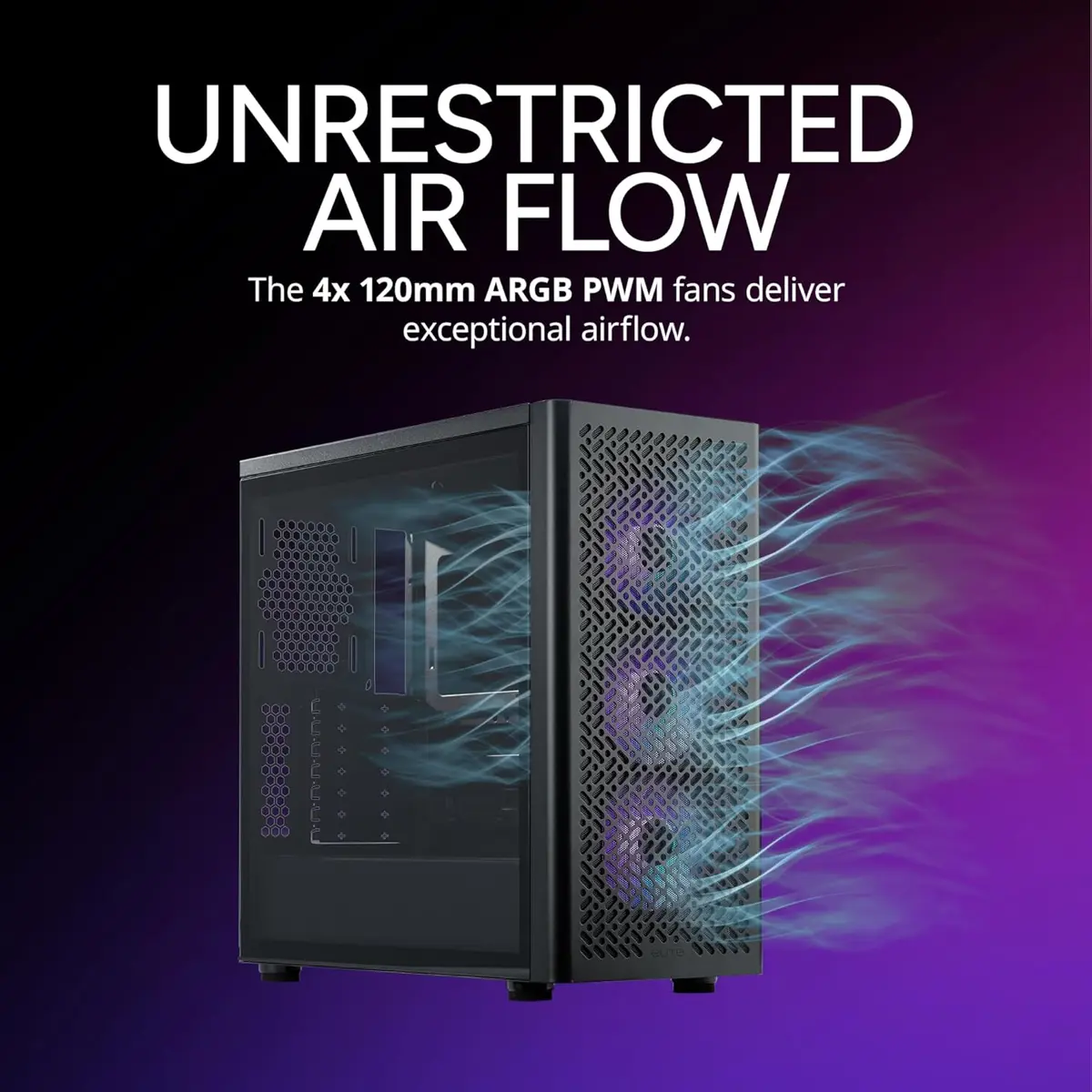 ARGB Ready Out of the Box: Comes with three pre-installed 120 mm ARGB front fans for vibrant lighting and strong airflow.