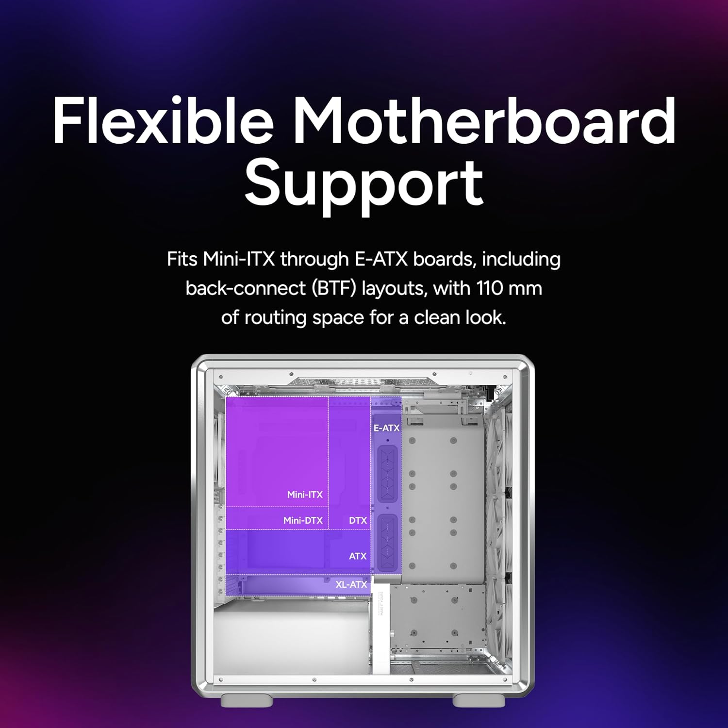 Motherboard Support Mini-ITX, Mini-DTX, Micro-ATX, ATX, E-ATX*, SSI-CEB* (*Conditional)