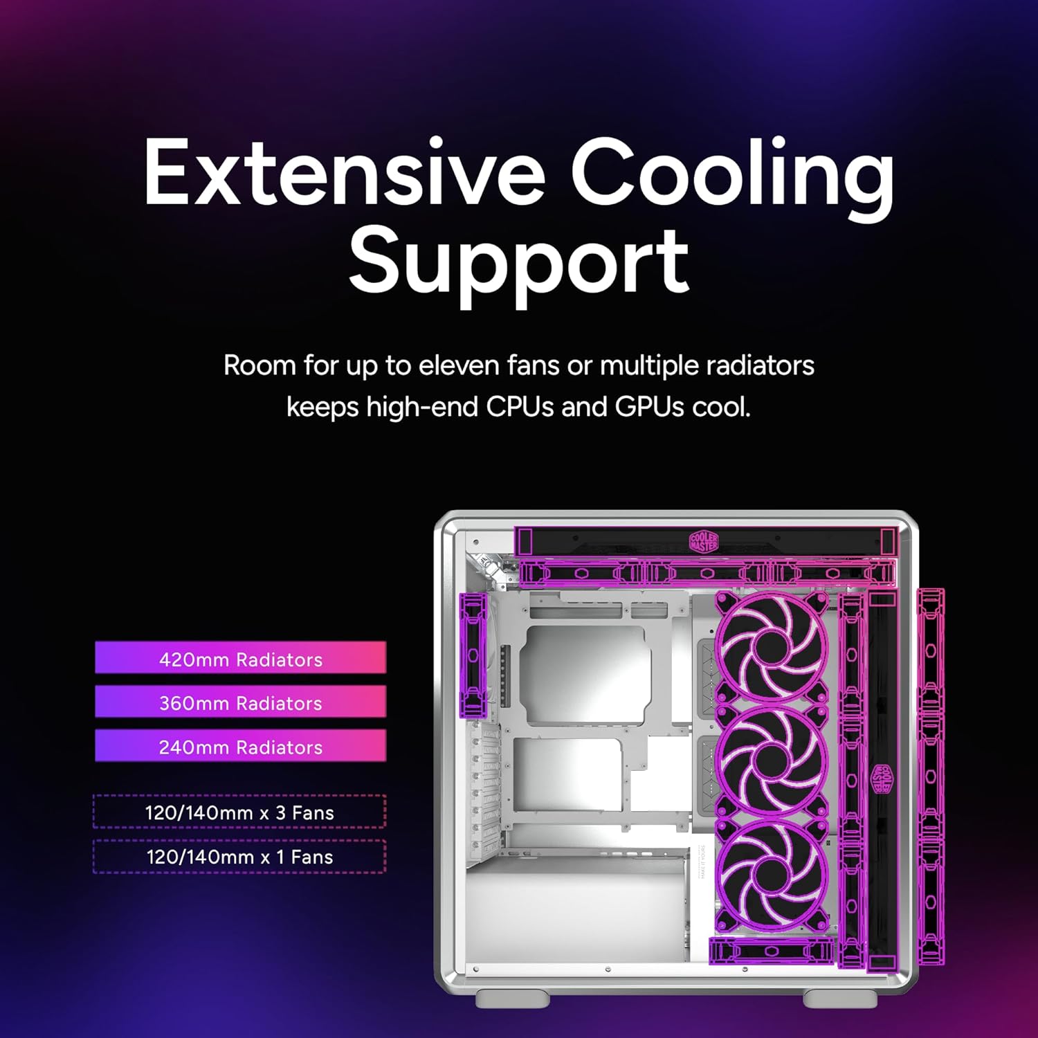 Cooling Support Up to 420mm radiators