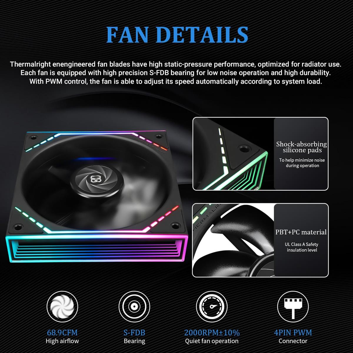 ARGB Sync: Fully addressable RGB lighting on both the pump and fans, compatible with major motherboard software (ASUS Aura, MSI Mystic Light, etc.).
